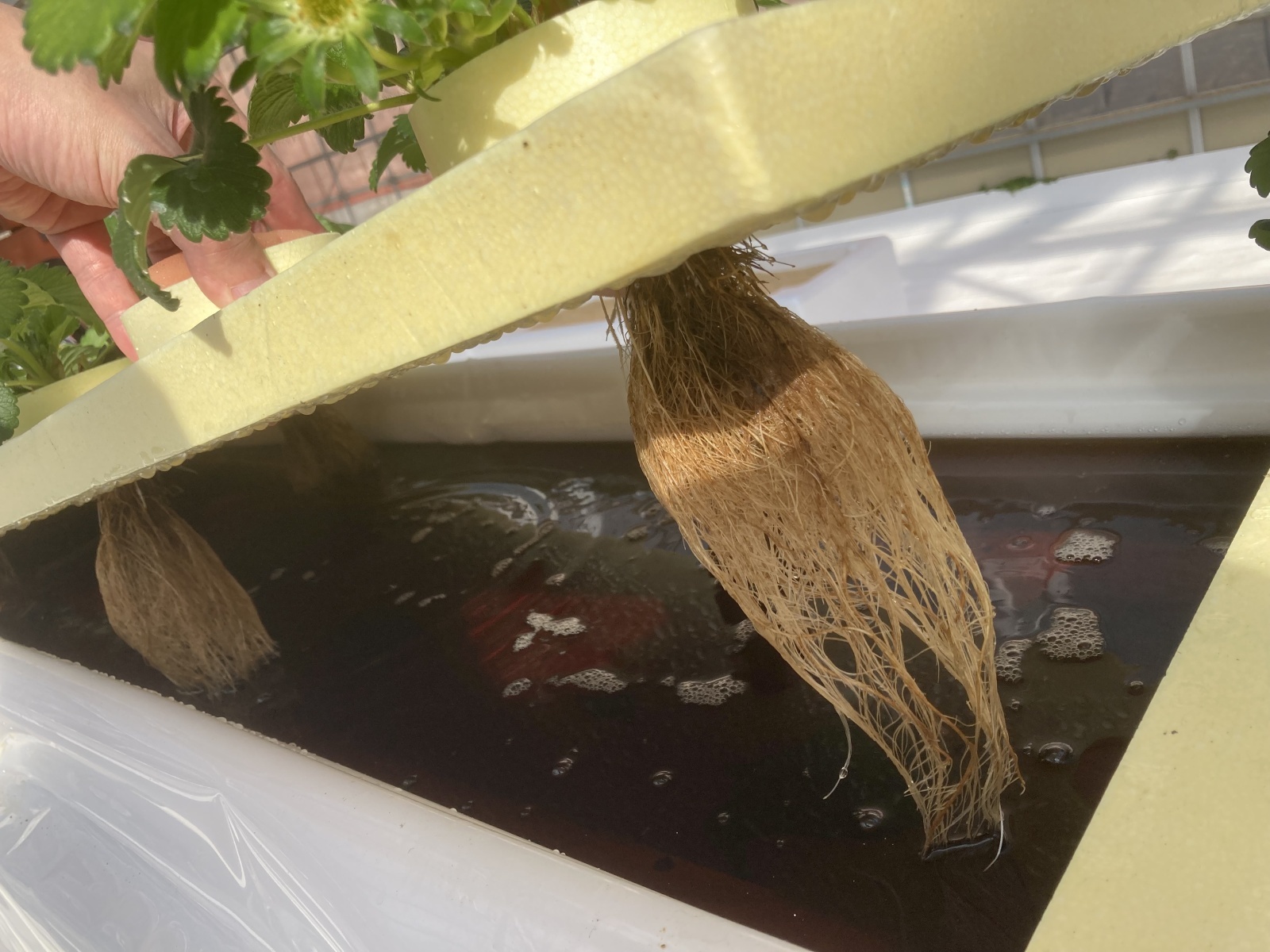 いちごの葉っぱに、キラリ 2025年10月24日 昨年、水耕栽培で育てていた、いちごの写真を見返していたら、葉っぱの先に小さな水滴がついているのを見つけました。朝露かな?と思って調べてみると「溢液現象(いつえきげんしょう)」というそうです。植物の葉の先端にある「水孔」から余分な水分がそっと押し出される現象です。 根っこが元気に水を吸い上げている証なんだとか。いちごの葉がピンと立って水滴がきらりと光る様子は、なんだか植物が「今日も調子いいよ」と教えてくれているみたいでした。このとき使っていた肥料のは、微生物の力を活かした「生きてる肥料」。菌根菌も、水の中で頑張ってくれたのかな。 そう思えた瞬間でした。 Tweet Facebookコメント «前 次» 菌根菌日記