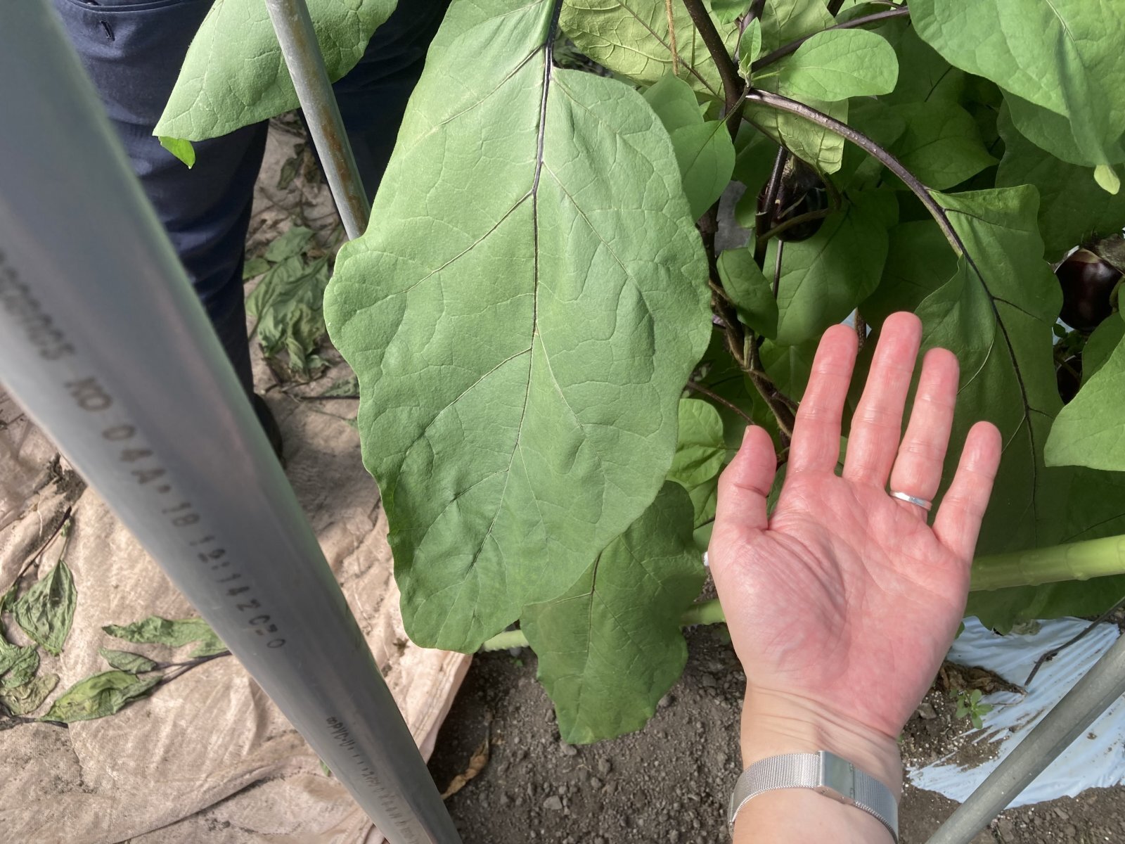 試しに182cmの成人男性の手と比べてみると、まるで子どもの手みたいに見える茄子の葉。